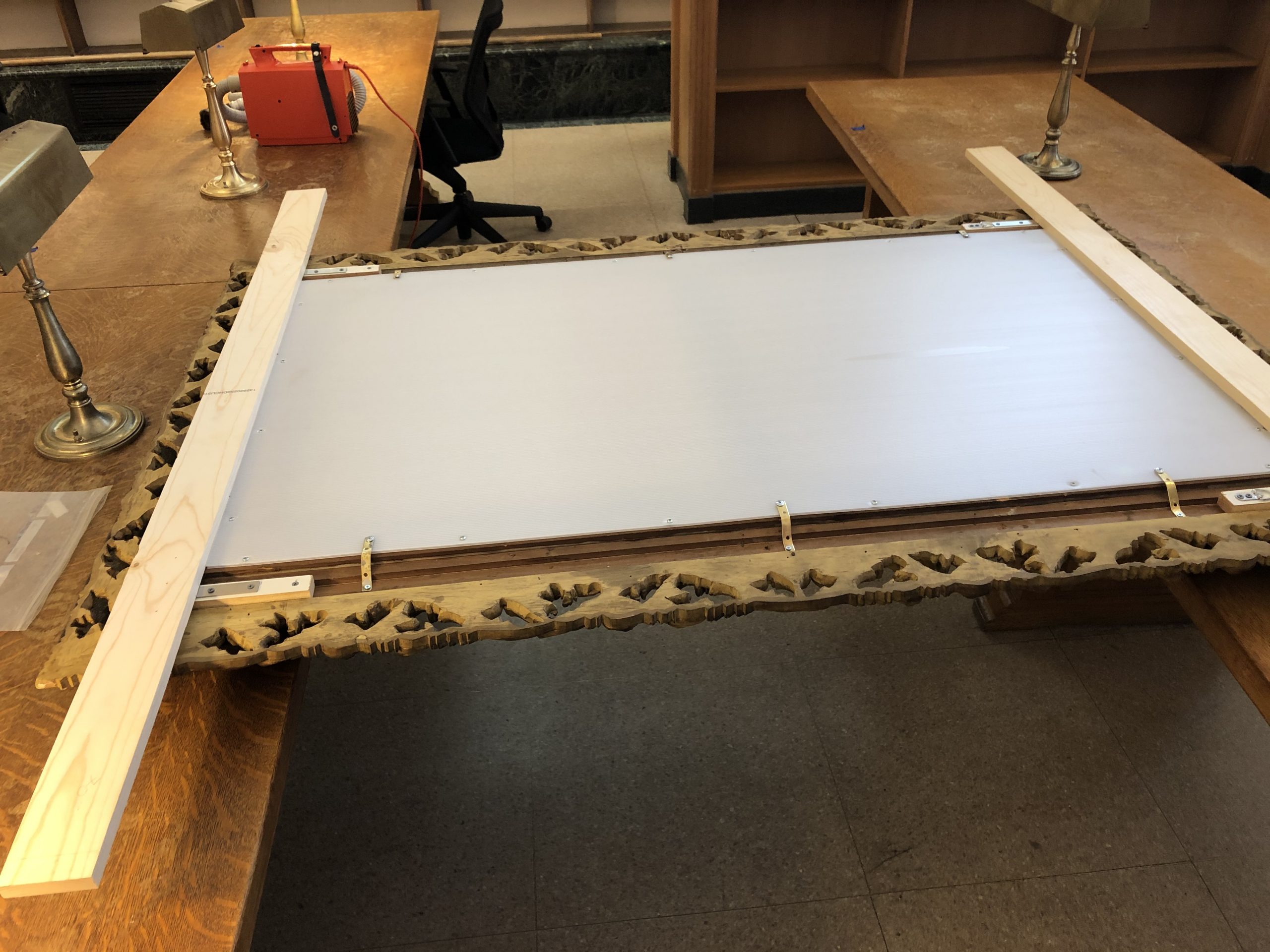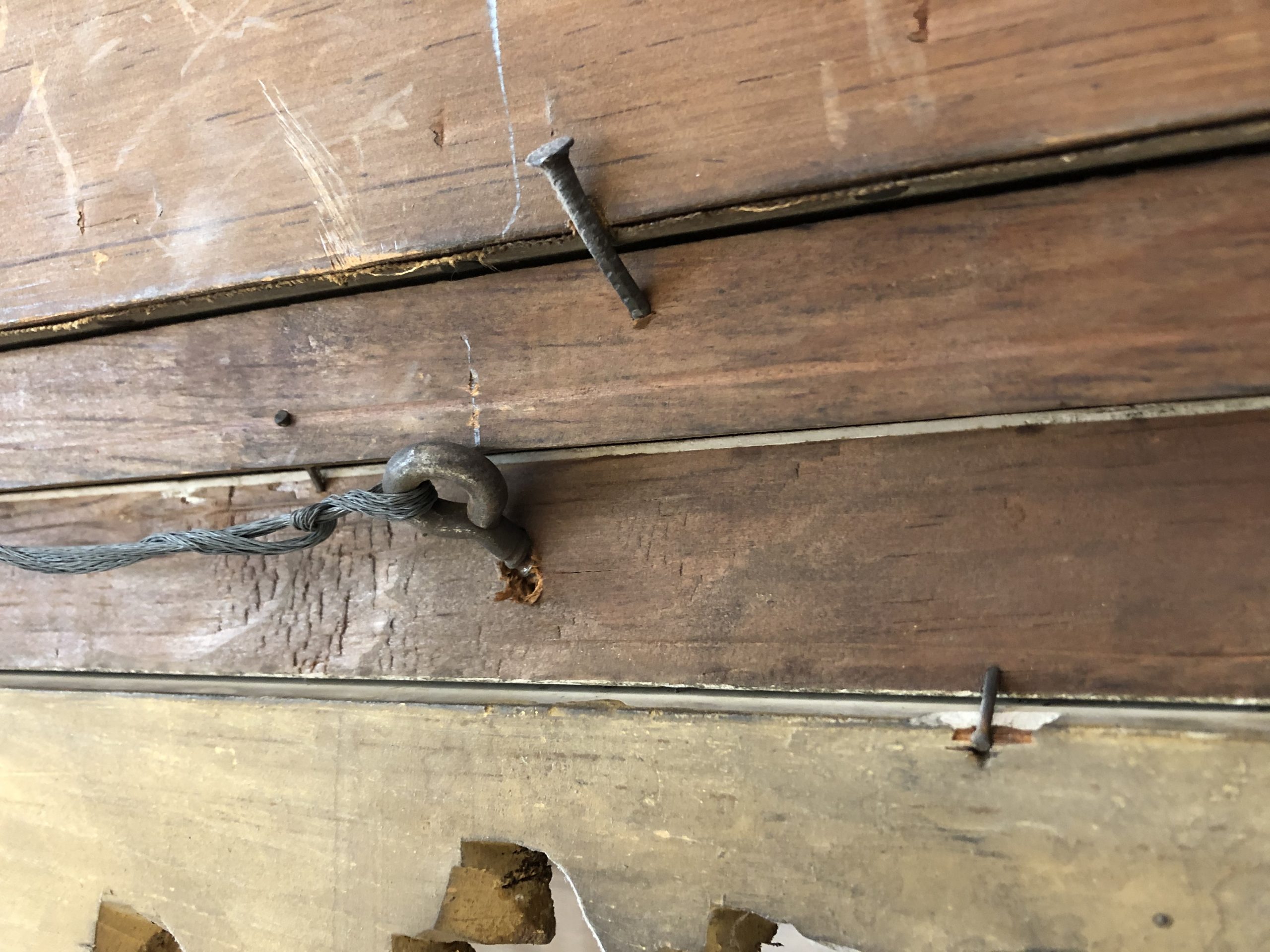 Next step was to attach coroplast backings and mounting hardware so we could screw them into place in the crates. It also gave us a chance at a closer look at the damage the frames have sustained over the years. Our decision to remove these now was confirmed when we saw that the eye screws in some were starting to pull out of the frames.