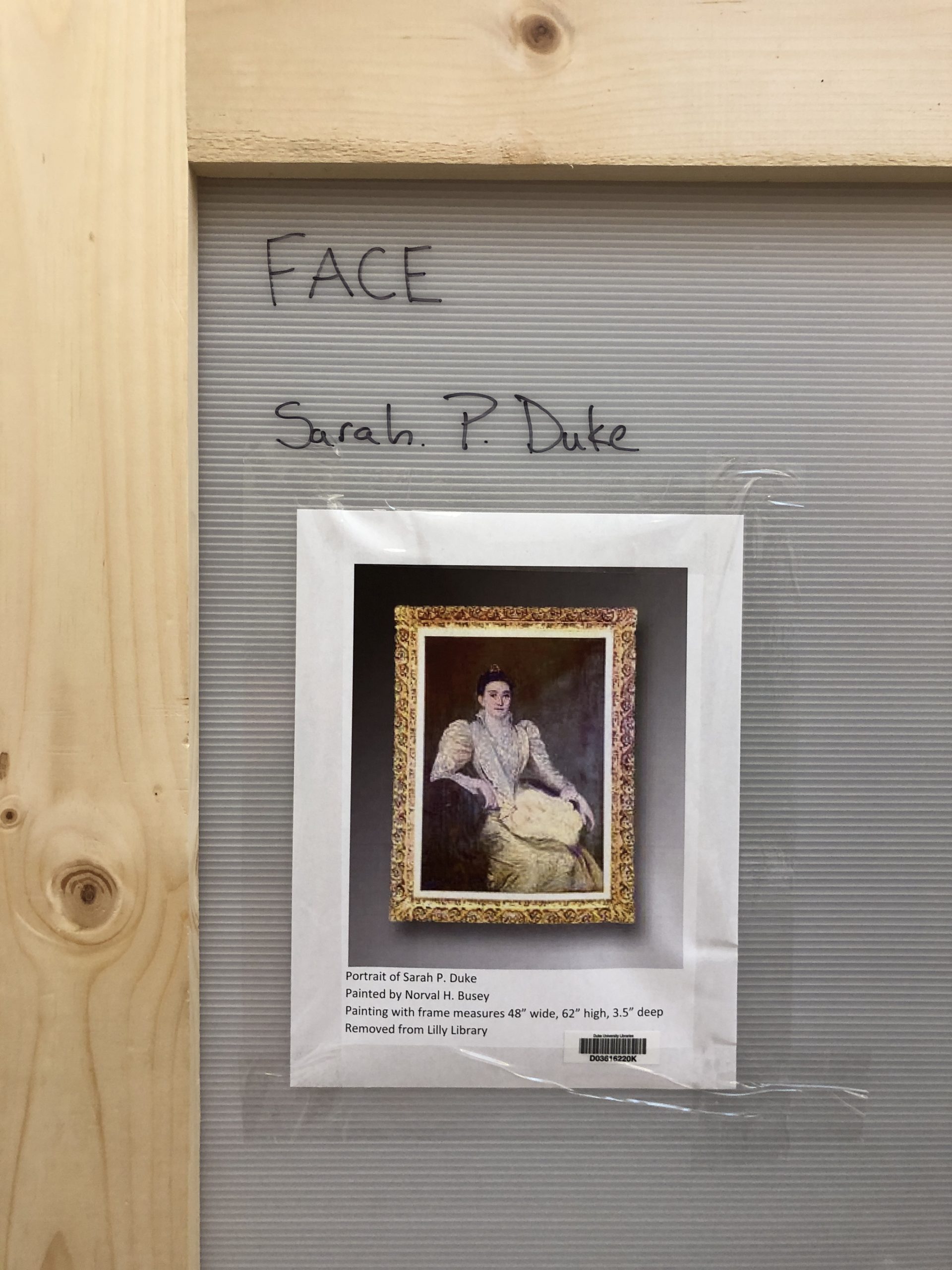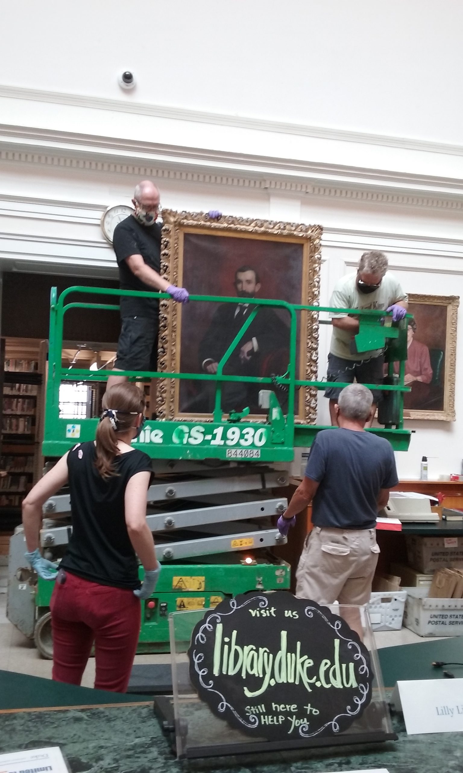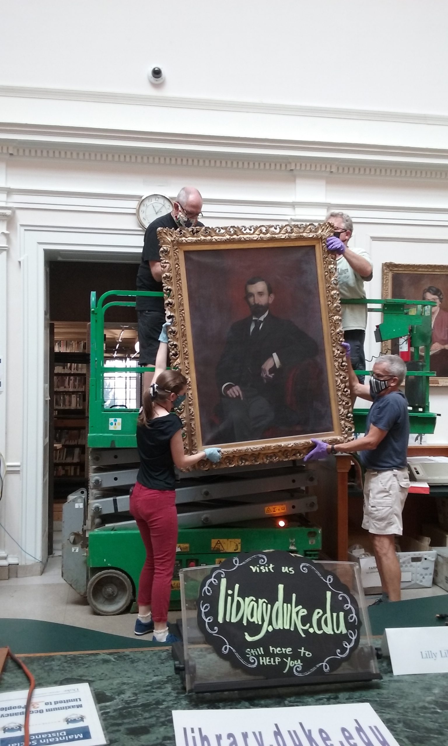 As readers may remember we had a painting at Lilly Library spontaneously fall off the wall this summer while we were all working from home. The painting’s hanging wire was very brittle and snapped. It’s difficult to say whether it snapped first then fell, or broke on the way down as it snagged on the hook. Regardless, we started worrying about the wires on the Duke Family Portraits that hung high above the reference desk, and whether those, too, were in danger of falling. After consultation with Lilly and library administration, we decided we needed to remove these before the semester began and before people were in the building again.