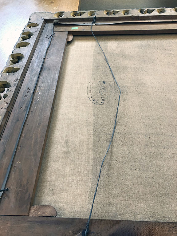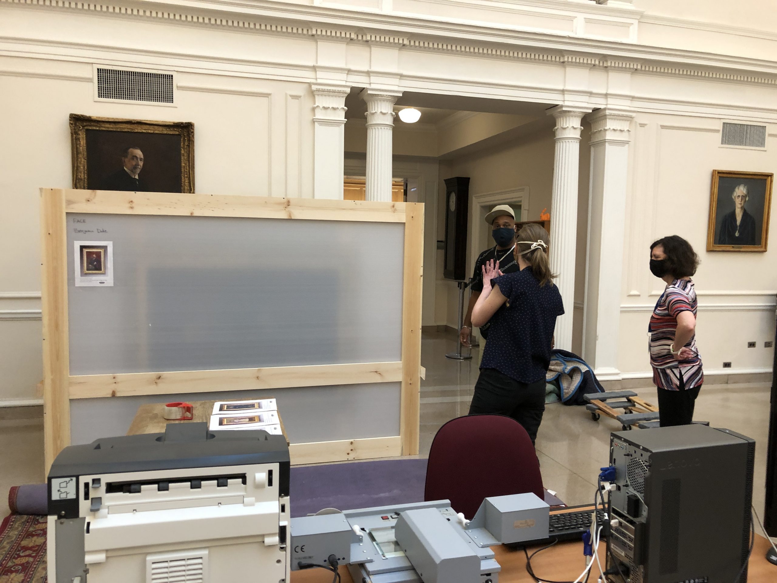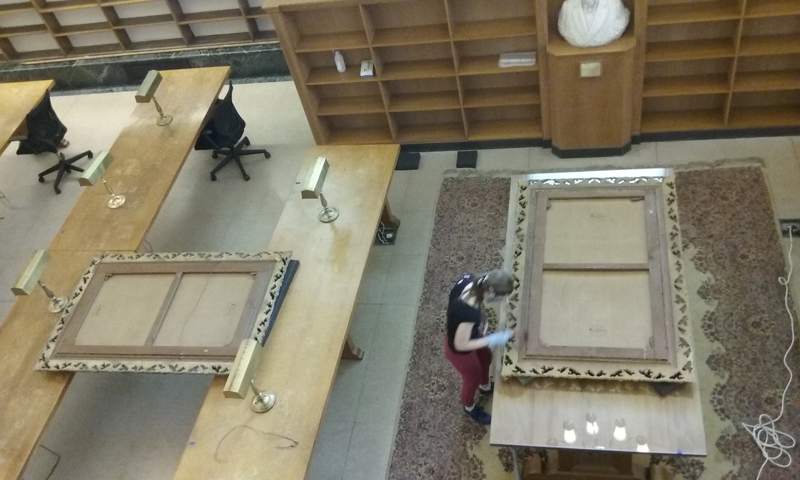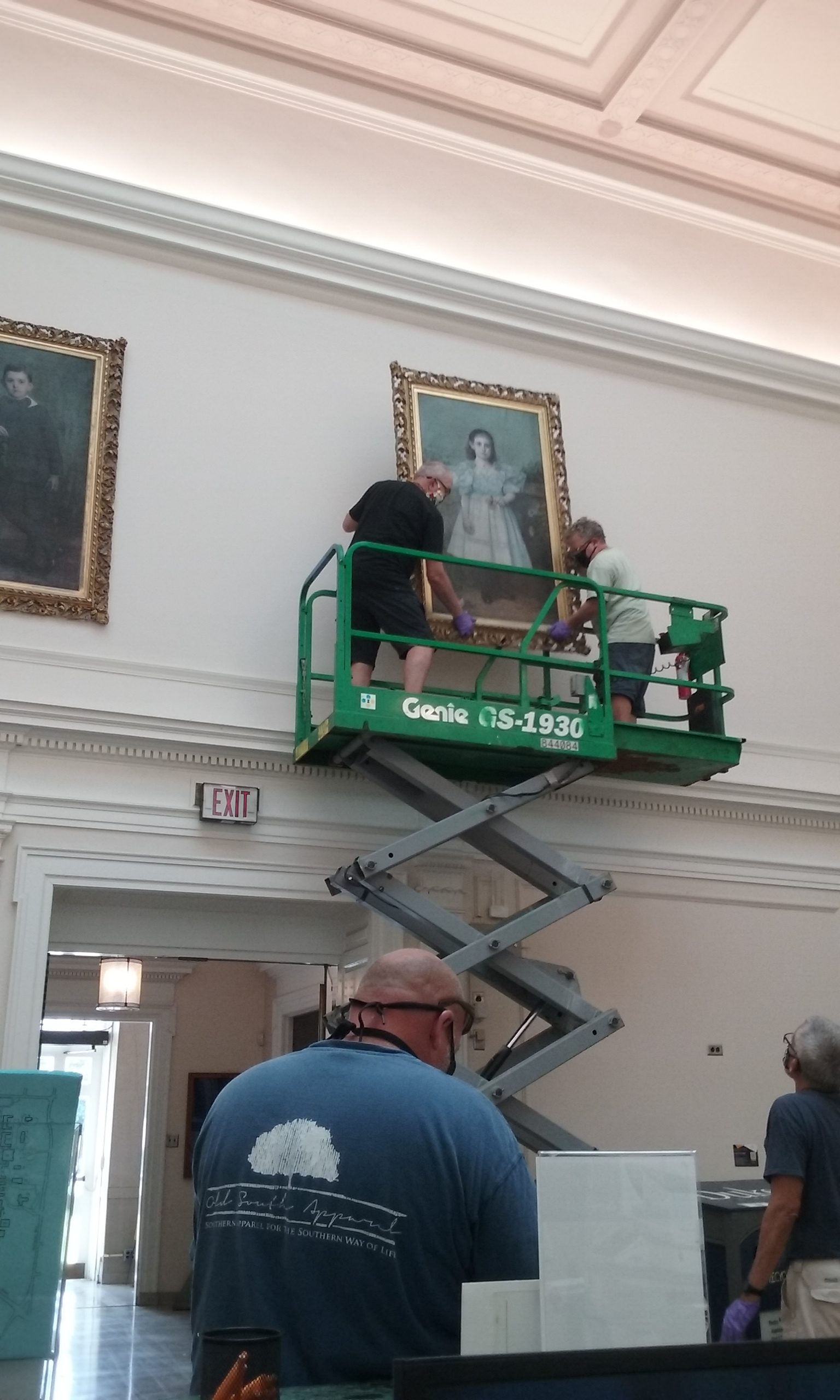 As readers may remember we had a painting at Lilly Library spontaneously fall off the wall this summer while we were all working from home. The painting’s hanging wire was very brittle and snapped. It’s difficult to say whether it snapped first then fell, or broke on the way down as it snagged on the hook. Regardless, we started worrying about the wires on the Duke Family Portraits that hung high above the reference desk, and whether those, too, were in danger of falling. After consultation with Lilly and library administration, we decided we needed to remove these before the semester began and before people were in the building again.