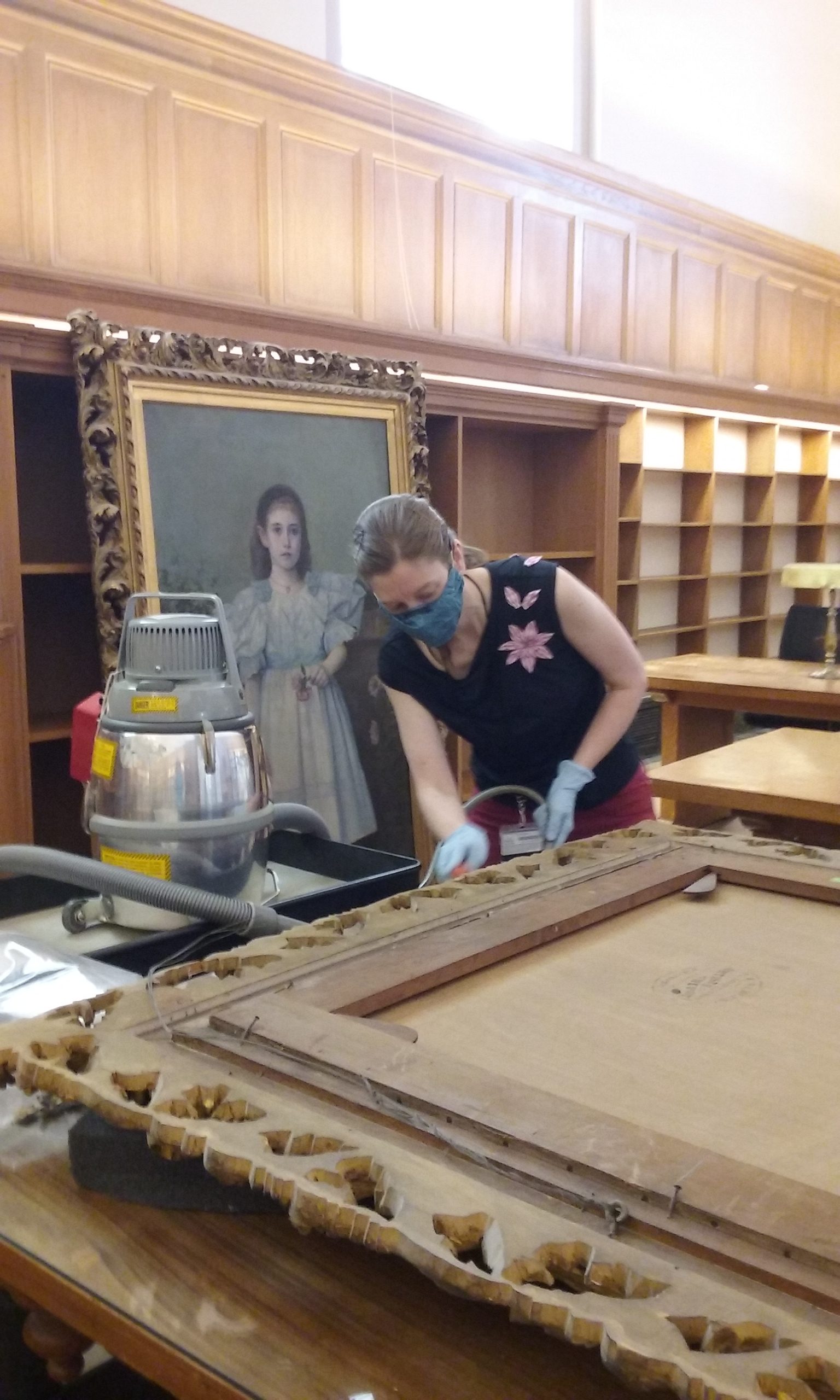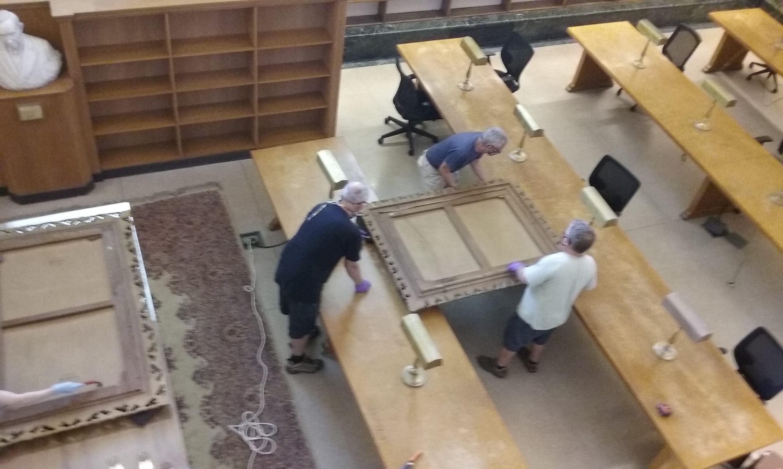 Before crating we wanted to vacuum the decades of dust off the frames and paintings. While Rachel vacuumed, Peter and his crew kept removing paintings from the wall.
