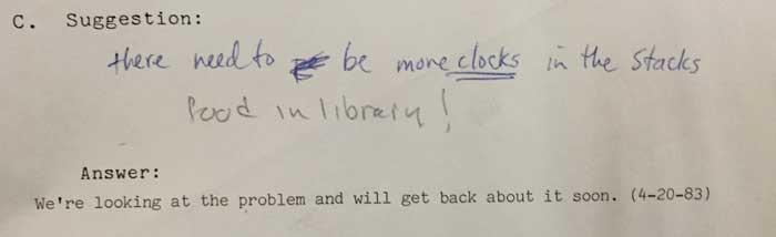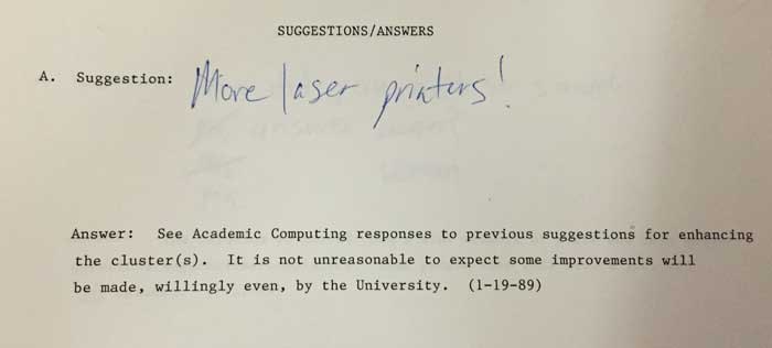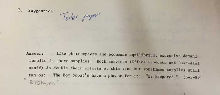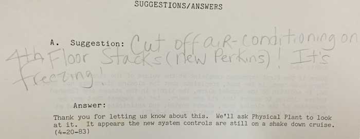 In September of 1982, a librarian at Duke set up a simple loose-leaf binder suggestion book in the lobby of Perkins Library. Each page in the book had a spaces for three suggestions/questions and three answers. In October of that year, the first group of pages with written suggestions and questions were removed, taken home by that librarian and answered in long-hand, then typed up by an administrative assistant directly onto the original pages and placed back in the book for anyone to read. This was the beginning of the Perkins Library Suggestion/Answer Book, a popular tradition that would live on, in more than one form, for more than twenty years.