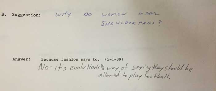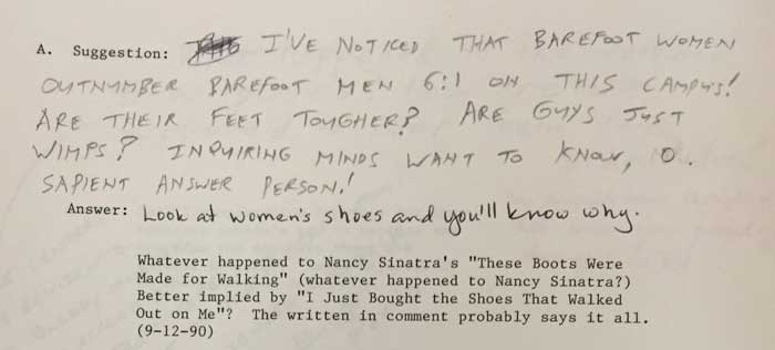 The pages are fascinating. The suggestions and questions are signs of the times, demonstrate student engagement with the library and the University as a whole, and show students being students: curious, angst-y, angry, grateful, silly, and thoughtful. In return, the Answer Person is both serious and facetious, deflecting offensive questions with jokes, omitting names, giving in-depth answers from outside sources, taking constructive suggestions and compliments to heart, and generally being a librarian (often instructing suggest-ers and questioners where they can find their answers instead of simply providing easy answers for them).